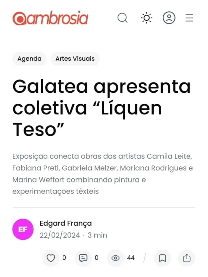 Revista DasArtes | Fresta ArtSoul | Ambitude Folha SP | Líquen Teso AQA | Líquen Teso Revista DasArtes | Achego Celeste | Achego Revista DasArtes | ……..seu poema Women on Walls | Líquen Teso Revista DasArtes | Arestas David Massena | Líquen Teso Revista DasArtes | Blombô Ambrosia | Líquen Teso Revista DasArtes | Ambitude Harper's Bazaar